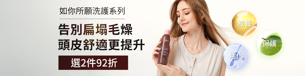 排序 商品價格低高 商品價格高低 上架時間新舊 上架時間舊新 點閱高低 點閱低高 40 60 第1頁 如你所願洗髮精 NT$790 數量 1234567891011121314151617181920 選購 如你所願護髮素 NT$880 數量 1234567891011121314151617181920 選購 1 行銷活動 如你所願系列 | 任選2件92折
